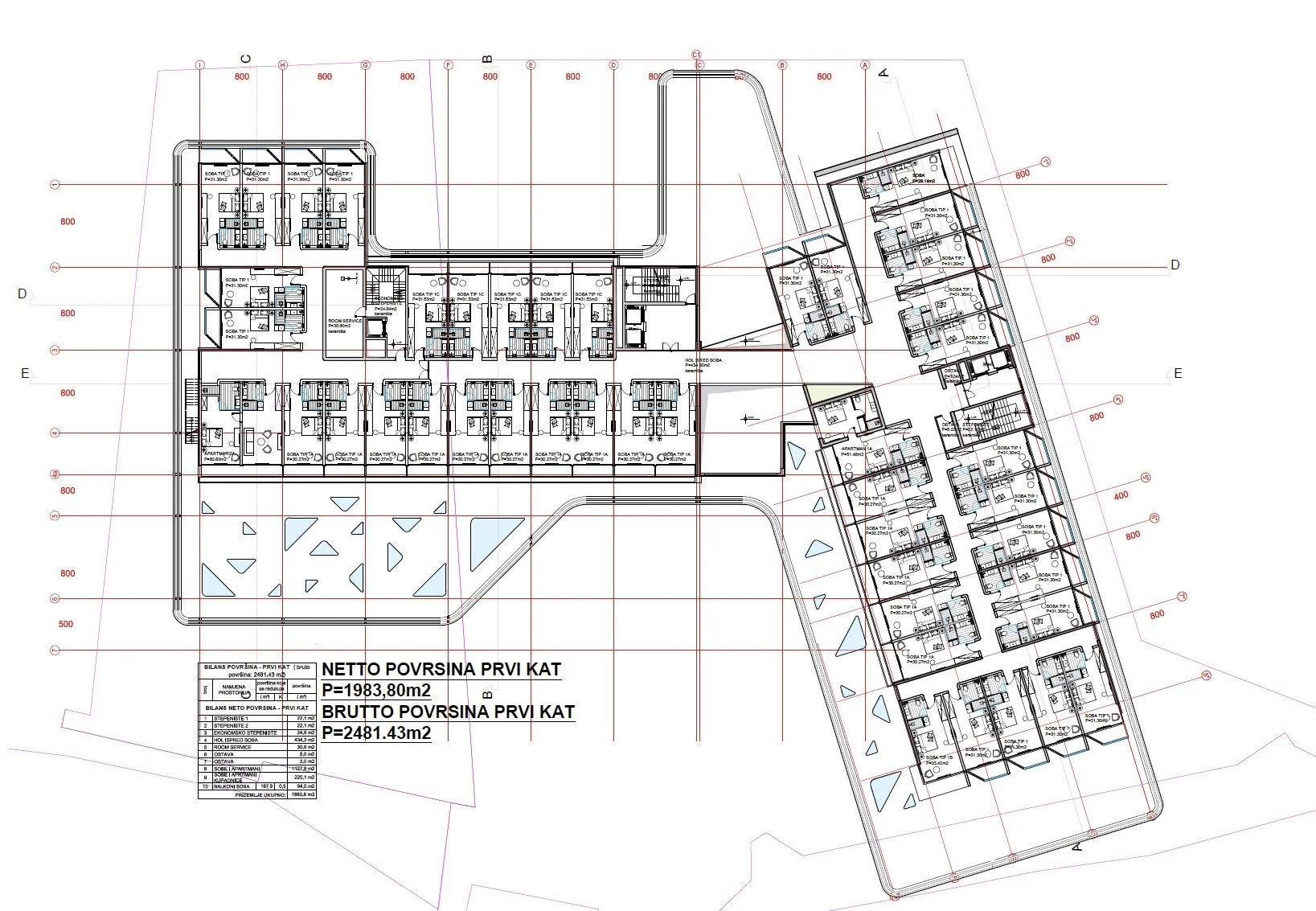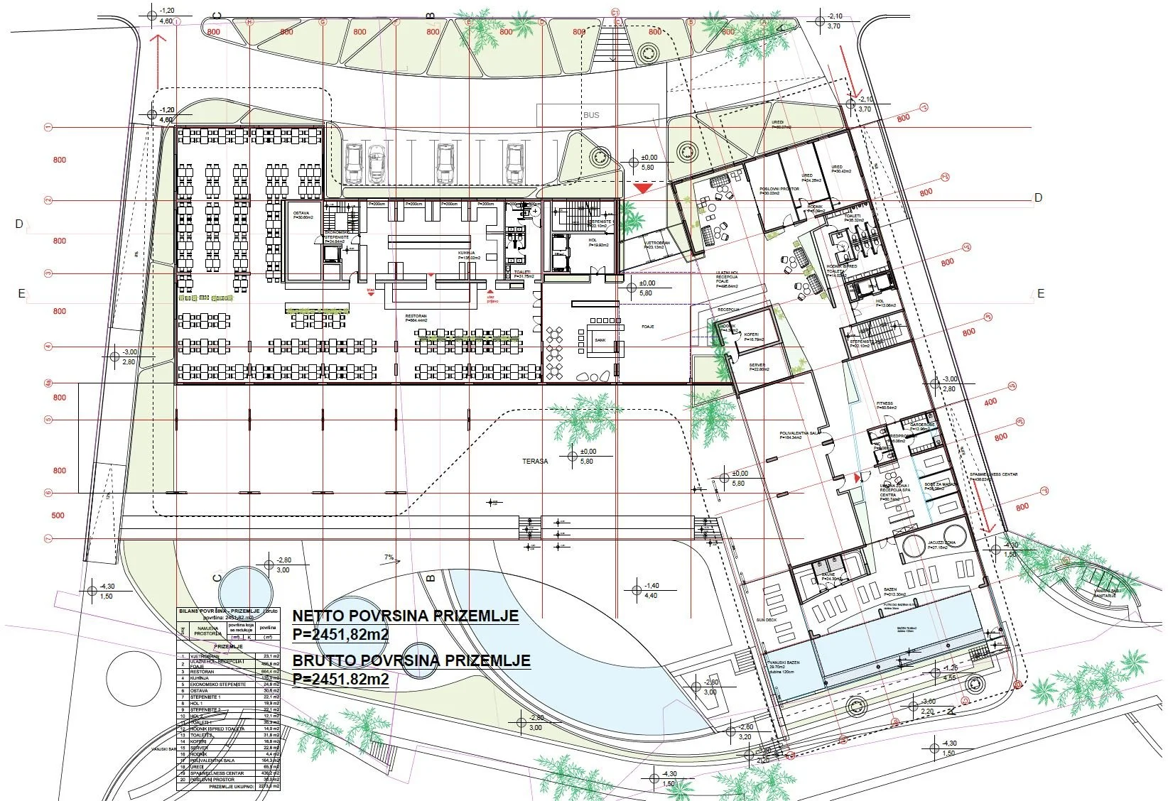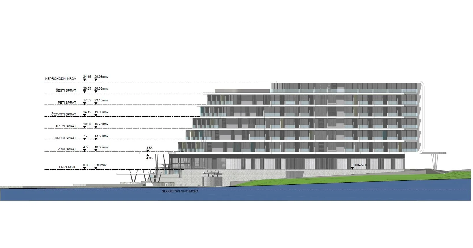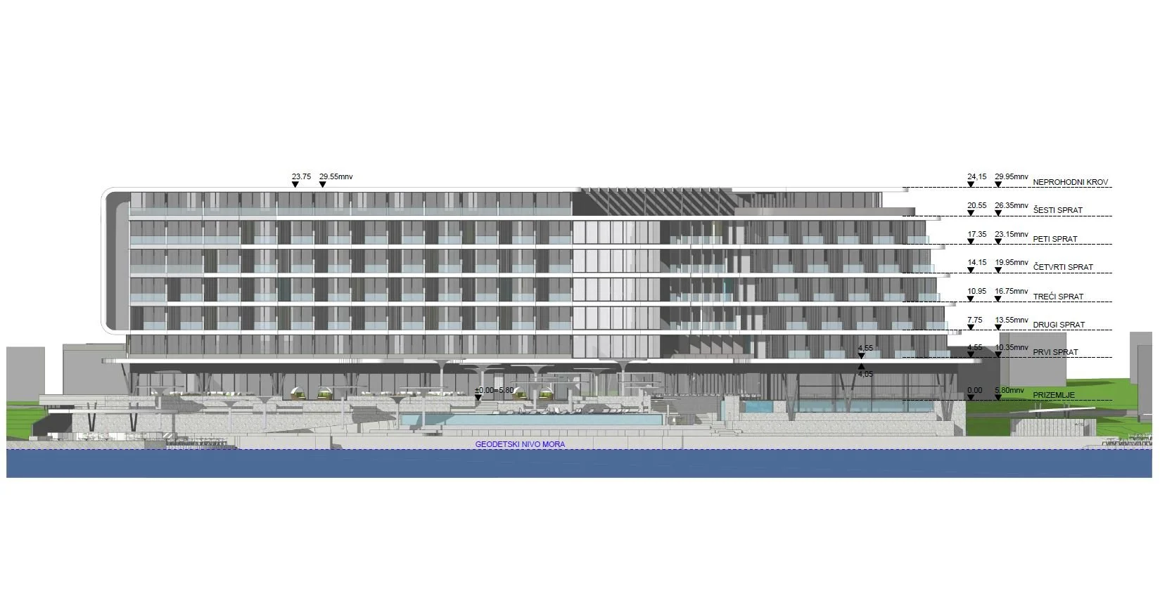 POZICIJA HOTELA KUMBOR JE KAP DO MORA. OVA NESVAKIDAŠNJA LOKACIJA JE INSPIRACIJA ZA SVAKOG ARHITEKTU. SVAKU GRAĐEVINU ODREĐUJU TRI KOMPNENTE, SUNCE, LOKACIJA, ČOVJEK KAO KORISNIK I KAO INVESTITOR. KONTEKST ZA OVAJ OBJEKAT JE I RAĐEN U KOMPILACIJI OVIH KOMPONENTI. LOKACIJI JE TRAPEZASTOG OBLIKA KOJOJ SE PRILAZI SE SA SJEVERNE STRANE, A ONA SE OD ISTOKA DO ZAPADA OTVARA PREMA MORU. REKLI BI IDEALNA SITUACIJA. TO JE I ODREDILO OBLIK I DISPOZICIJU HOTELA . TOM FORMOM SMO JASNO PODIJELI AURU HOTELA - JAVNO I PRIVATNO , JER HOTEL SVOJIM GABARITOM JE UPRAVO FILTER, KOJI DEFINIŠE OVU SPIRITUALNU DUALNOST. DOČEKUJE VAS ZATVORENA I PERFORIRANA, GDJE TREBA, ULAZNA SJEVERNA FASADA . PROLASKOM KROZ RECEPCIJU, OTVARA VAM SE POGLED PREMA MORU I PRIZORU, ZBOG ČEGA SE DOLAZI U OVAKVE HOTELE . TA UNUTARNJA PRAZNINA PROSTORA OD HOTELA DO PLAŽE, TE TERASE HOTELA NA KOJIMA SE OSJEĆAŠ KAO U POVLAŠTENOJ LOŽI DOK SU ISPOD TEBE U PARTERU OTVORENI BAZENI, ŠETALIŠTE, PLAŽA SA MOLOVIMA I FINALNI IZRAZ OVE PROSTORNE DRAMATURGIJE - PLAVO MORE.